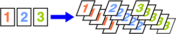 Třídí skenované originály do sad a mění orientaci (na výšku/šířku). Příklad: Když je jako počet kopií nastaveno 5 ![]() |