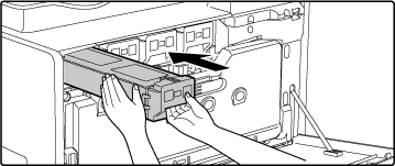 (Eksempel): udskiftning af den gule tonerpatronHold på tonerpatronen med begge hænder som vist og træk den