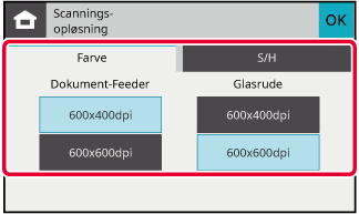 Opløsningen kan indstilles til både dokumentfeeder og glasplade. Når indstillingerne er angivet, skal du trykke på tasterne [OK] og [Tilbage] efter hinanden.