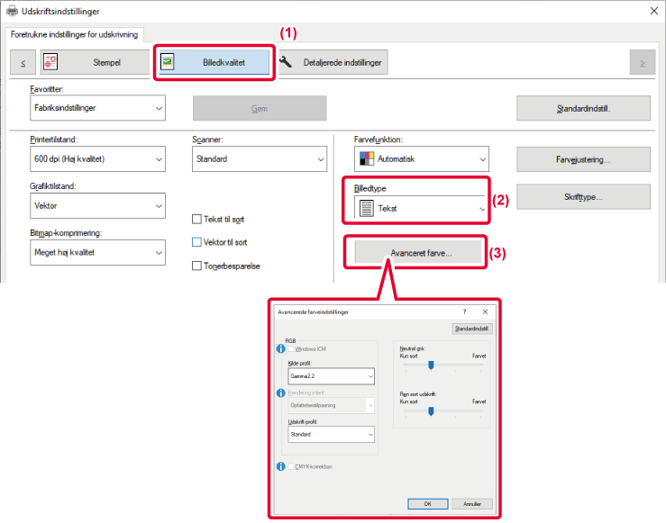 Der er også avancerede farveindstillinger som f.eks. farvestyringsindstillingerne