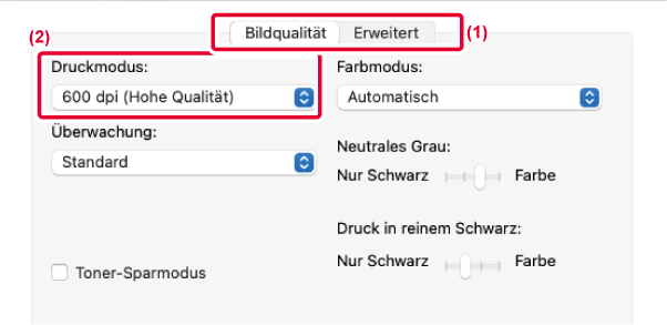 Für "Druckmodus" (Auflösung) sind die folgenden beiden