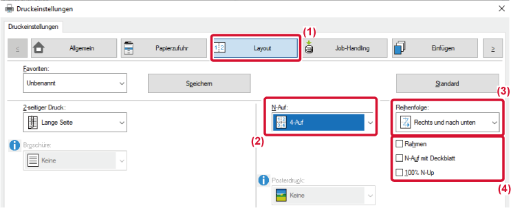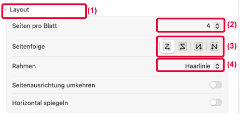 (4 Seiten pro Blatt) ausgewählt wurde, werden je nach ausgewählter Reihenfolge