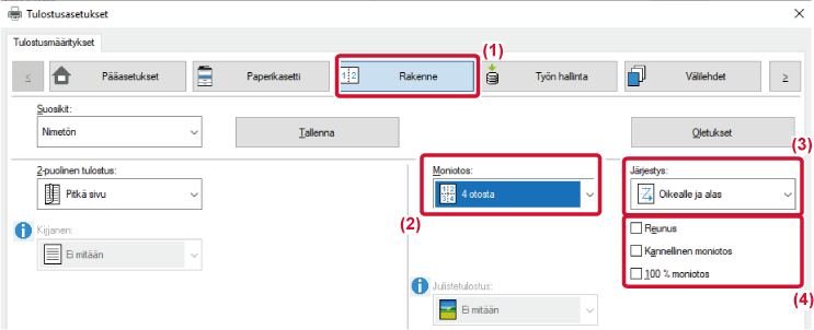 [4 otosta] (4 sivua arkilla), saavutetaan seuraavat tulostuksen tulokset