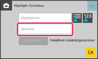 Jos käyttäjänimen rekisteröintiä ei ole suoritettu asetustilassa, vain LDAP-tunnistusta käyttävän käyttäjän on kosketettava [Käyttäjänimi]-tekstiruutua ja syötettävä käyttäjänimi näytön näppäimistöllä.