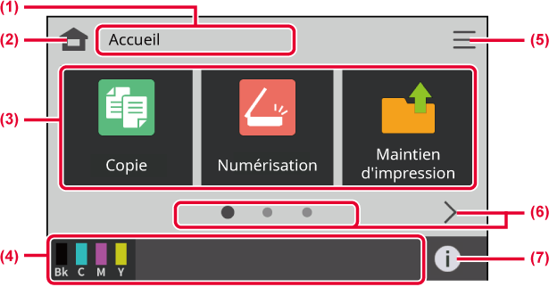 d'afficher l'écran d'accueil sur l'écran tactile. L'écran d'accueil affiche
