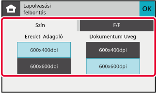 A felbontás a dokumentumadagolóhoz és a dokumentumüveghez külön-külön is megadható. Ha a beállításokkal végzett, koppintson egymás után a [OK] és a [Vissza] gombra.
