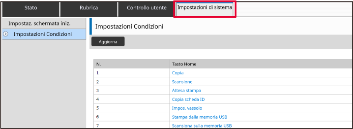 Nello stato predefinito di fabbrica, dopo aver inserito l'indirizzo IP, occorre immettere la propria password utente.Sulla pagina Web, fare clic sulla scheda [Impostazioni di sistema] → [Impostaz. schermata iniz.].