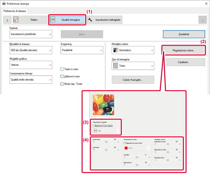 Le selezioni indicate di seguito consentono di modificare l'elaborazione delle immagini a colori per adattarsi alle singole preferenze. (Metodo di taratura dei colori: metodo di conversione dei colori RGB sul display, ecc. in colori CMYK nella stampante) |