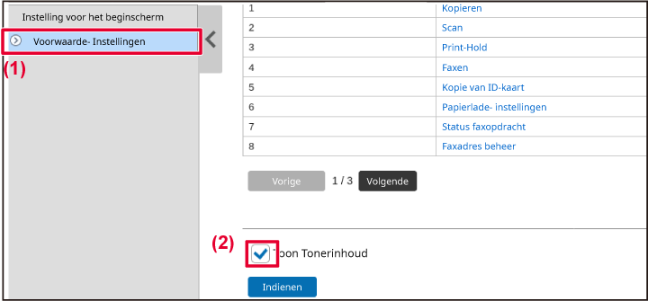 ).Selecteer het selectievakje "Toon Tonerinhoud" en klik op de knop [Indienen].