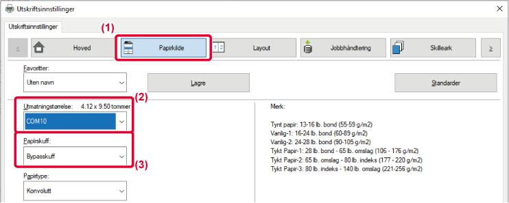 inn størrelse og type papir som skal brukes til utskriften og papirskuffen.