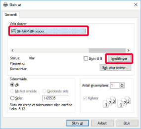 Velg skriverdriveren for maskinen, og klikk på [Innstillinger]-knappen.