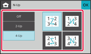 Coloque o original na bandeja do alimentador de documentos do alimentador automático de documentos ou no vidro de exposição.Toque na tecla [Outros] e na tecla [N-Up].