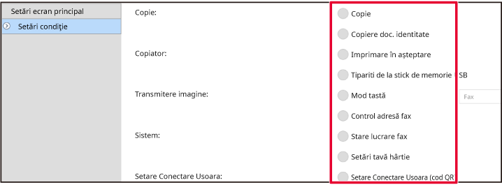 Anumite setări pot cere să introduceţi parola de utilizator după ce aţi executat clic pe [Setări ecran principal]. Dacă nu aţi efectuat autentificarea ca utilizator, trebuie să introduceţi parola de administrator.