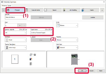 imprimată. Setările de finisare și modul color sunt indicate prin