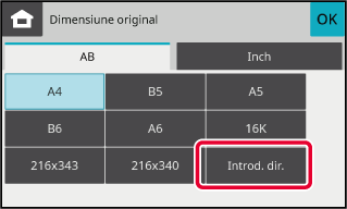 În ecranul de bază, verificaţi dacă formatul specificat este afişat pe tasta [Original].Scanarea optimă se efectuează prin selectarea