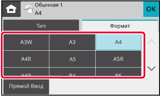 Коснитесь кнопки [Прямой Ввод], чтобы ввести числовое значение формата загруженной бумаги. Завершите изменение настроек и коснитесь кнопки [OK].
