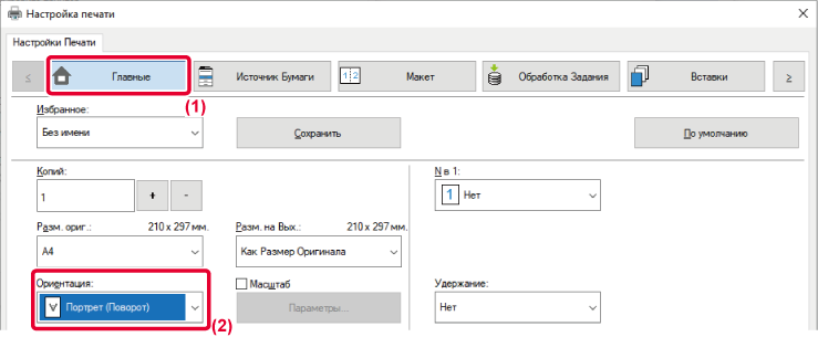- Выберите значение [Портрет (Поворот)] или [Альбом (Поворот)] в поле "Ориентация".