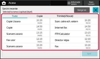 pe panoul tactil. Ecranul principal afişează tastele pentru selectarea
