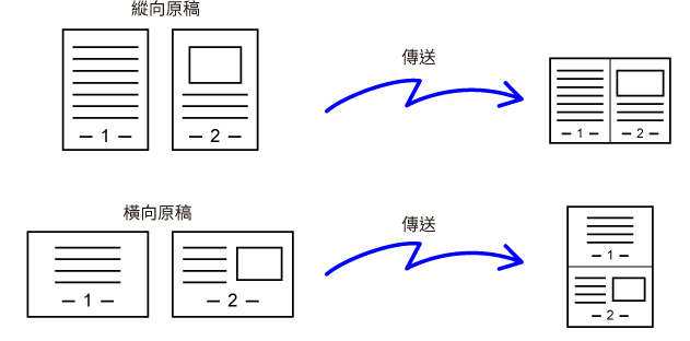 將兩頁原稿縮小至相同的尺寸,然後合併成一頁傳送。如果原稿頁數多而要減少傳送的頁數,此功能相當方便。