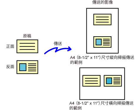 如果是標準尺寸(A4 (8-1/2" x 11")、B5 或 A5 (5-1/2" x 8-1/2")),則會從單流程送稿機和原稿玻璃台掃描原稿頁面。