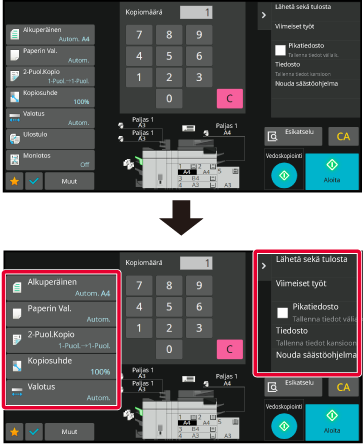Asetukset tallennetaan laitteeseen ja niitä sovelletaan.Normaalissa tilanäytössä, kuten kopioi tai
