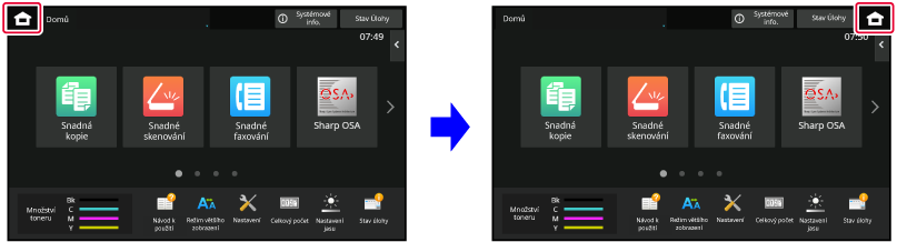 Klepněte na tlačítko [Systémová nastavení] → [Nastavení výchozí obrazovky] a poté na tlačítko [Umístění tlačítka Domů].