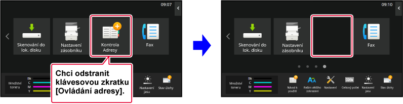 Nastavení jsou uložena v produktu a použita.Klávesové zkratky můžete na výchozí obrazovku