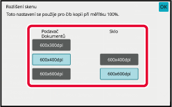 Rozlišení může být nastaveno pro zásobník podavače dokumentů i sklo pro dokumenty. Po dokončení nastavení klepněte postupně na tlačítko [OK] a [Zpět].
