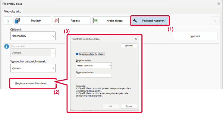 možnost [Vlastní vodoznak], je zaregistrován jednobarevný transparentní