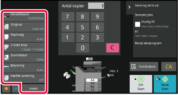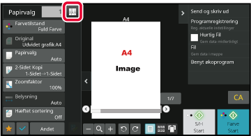 VALG AF PAPIRBAKKE TIL KOPIERINGAUTOMATISK TOSIDET KOPIERINGVÆLG AUTOMATISK FORHOLDOUTPUTKOPIFARVEFUNKTIONERVALG AF RETNING OG STØRRELSE