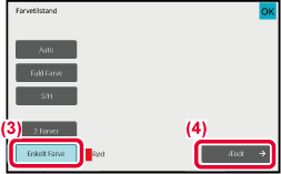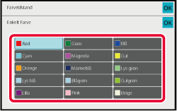 Når indstillingerne er fuldførte, skal du trykke på [OK] på skærmen [Enkelt Farve] og kontrollere, at den ændrede indstilling vises ved siden af tasten [Enkelt Farve] på farvetilstandskærmen.