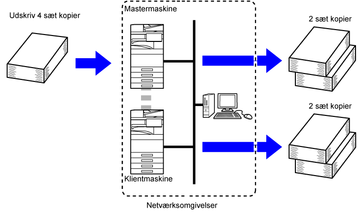 Der kan vælges op til 9999 kopier (sæt). Det angivne antal kopier deles mellem den primære og den sekundære enhed. Hvis antallet af kopier er ulige, vil den primære enhed producere flere kopier end den sekundære enhed.