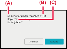 På bekræftelseskærmen vises antallet af scannede originalark i (A), antallet af scannede sider i (B), og antallet af sider ekskl. blanke sider i (C).