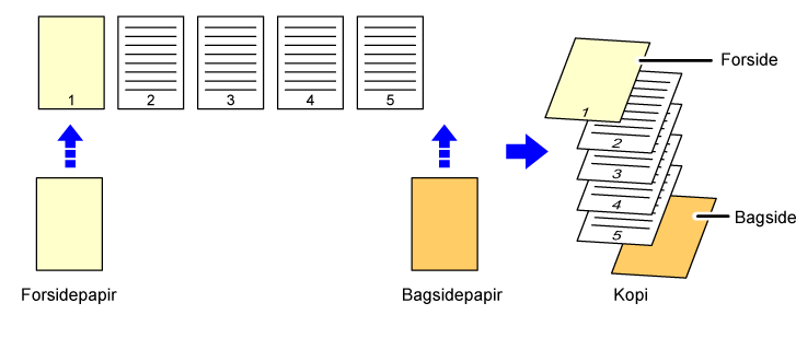 ![]() Laver en 1-sidet kopi på den første originalside til forside og tilføjer en bagside i slutningen af kopierne. |