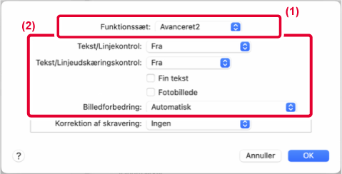 Du kan gøre kanter på tekst og grafik blødere eller skarpere. Automatisk: Udfører optimal billedforbedring. Fra: Der anvendes ingen billedforbedring. Skarp: Billedforbedring anvendes skarpt. Svag: Billedforbedring anvendes svagt. |