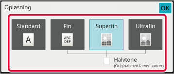 Vælg denne indstilling, hvis din original er et fotografi eller har farvenuancer (som f.eks. en farveoriginal). Denne indstilling producerer et tydeligere billede end, hvis du bruger [Fin], [Superfin] eller [Ultrafin]. Halvtone kan ikke vælges, hvis [Standard] bruges. |