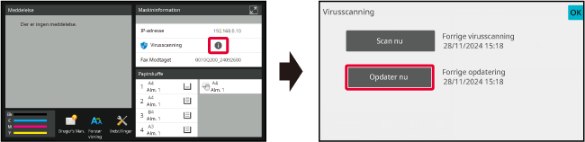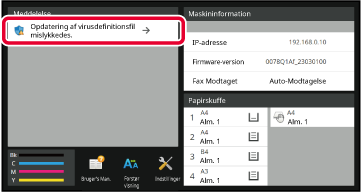 Når der registreres en virus i forbindelse med inputdata, vises det på berøringspanelet, at der er registreret en virus, inputdataene eller det job, der skal indlæses, annulleres, og de data eller jobdata, der skulle udskrives, kasseres. Data i datainputkilden (USB-hukommelse, ekstern server osv.) bliver ikke slettet. Når der registreres en virus i forbindelse med outputdataene, vises det på berøringspanelet, at der er registreret en virus, outputdataene eller det job, der skal udskrives, annulleres, og outputdataene eller jobdataene slettes. Meddelelsen om virusdetektion bliver vist i "Besked" på skærmen Systeminformation. |