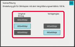 Die Auflösung kann sowohl für den Originaleinzug als auch für das Vorlagenglas festgelegt werden. Berühren Sie nach dem Beenden der Einstellungen nacheinander die Tasten [OK] und [Zurück].