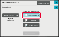 Wenn nur der Einzugsbogen A eingefügt wird, berühren Sie die Taste [Keine Kopie erst.].