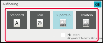 Wählen Sie diese Einstellung, wenn das Original ein Foto ist oder Farbschattierungen enthält (z. B. farbige Originale). Mit dieser zusätzlichen Einstellung erhalten Sie ein klareres Abbild als bei Verwendung der Einstellungen [Fein], [Superfein] oder [Ultrafein] allein. Halbton kann nicht gewählt werden, wenn [Standard] verwendet wird. |