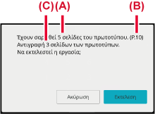 Στην οθόνη επιβεβαίωσης, ο αριθμός των σαρωμένων πρωτότυπων φύλλων εμφανίζεται στο (Α), ο αριθμός των σαρωμένων πλευρών σελίδας στο (Β) και ο αριθμός των αντιγράφων χωρίς τις κενές σελίδες εμφανίζεται στο (C).