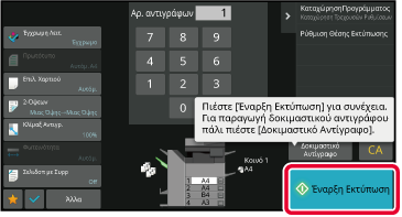 Δημιουργήστε μόνο ένα σετ αντιγράφων.Ελέγξτε το αποτέλεσμα της αντιγραφής. Εάν δεν εντοπίσετε κανένα πρόβλημα, αγγίξτε το πλήκτρο [Έναρξη Εκτύπωση].