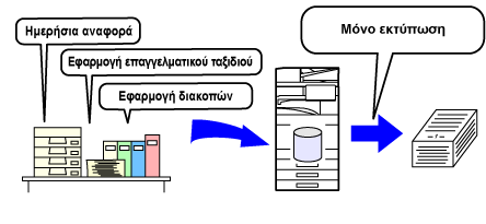 Κατά την εκτέλεση αντιγραφής, σάρωσης ή άλλης εργασίας, με τη λειτουργία αυτή τα δεδομένα των εγγράφων αποθηκεύονται στην τοπική μονάδα δίσκου. Σε αντίθεση με το Γρήγορο Αρχείο, κατά την αποθήκευση του αρχείου υπάρχει η δυνατότητα προσάρτησης πληροφοριών διάφορων τύπων, ώστε να είναι δυνατή η αποτελεσματική διαχείριση των αρχείων. Μπορείτε επίσης να ορίσετε κωδικό πρόσβασης. |