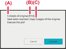 On the confirmation screen, the number of scanned original sheets appears in (A), the number of scanned sides in (B), and the number of copies excluding blank pages in (C).