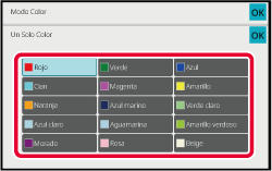 Una vez haya completado la configuración, toque [OK] en la pantalla [Un Solo Color], y compruebe que la configuración modificada se muestra al lado de la tecla [Un Solo Color] en la pantalla de modo de color.