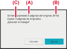 En la pantalla de confirmación, el número de hojas originales escaneadas aparece en (A), el número de caras escaneadas aparece en (B) y el número de copias, excluidas las páginas en blanco, aparece en (C).