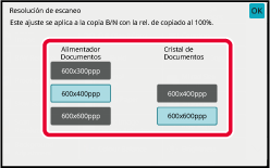 La resolución se puede establecer tanto para el alimentador de documentos como para el cristal de exposición. Una vez completada la configuración, toque consecutivamente las teclas [OK] y [Atrás].