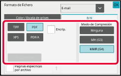 *1 Si se selecciona PDF (incluido cifrado y compresión alta) como formato de archivo, se podría utilizar la compresión flate para reducir el tamaño del archivo.