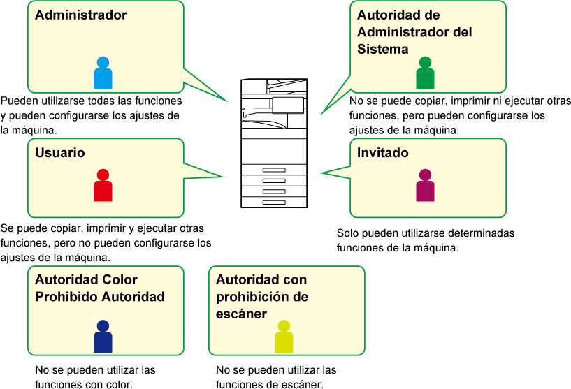 las funciones y los ajustes que pueden utilizar los usuarios pertenecientes