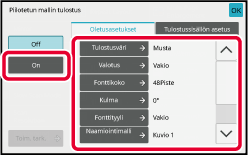 Kosketa [On]-näppäintä ja määritä tarpeen kukin kohta [Oletusasetukset]-välilehden asetuksissa.